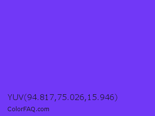 YUV 94.817,75.026,15.946 Color is a normal indigo color and the nearest color is Blue Violet #8a2be2. Hex code #7138f7 and RGB value is rgb(113,56,247). In RGB color space, this color is composed of 44% red, 22% green, 97% blue, In CMYK color space, this color is composed of 54% cyan, 77% magenta, 0% yellow , 3% black , In HSL color space, this color has a hue angle of 258° , 92% saturation and 59% lightness.