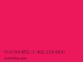 YUV 94.852,-1.406,124.664 Color is a normal rose color and the nearest color is Ruby #e0115f. Hex code #ed175c and RGB value is rgb(237,23,92). In RGB color space, this color is composed of 93% red, 9% green, 36% blue, In CMYK color space, this color is composed of 0% cyan, 90% magenta, 61% yellow , 7% black , In HSL color space, this color has a hue angle of 341° , 86% saturation and 51% lightness.