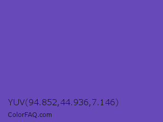 YUV 94.852,44.936,7.146 Color is a normal indigo color and the nearest color is Studio #714ab2. Hex code #6749ba and RGB value is rgb(103,73,186). In RGB color space, this color is composed of 40% red, 29% green, 73% blue, In CMYK color space, this color is composed of 45% cyan, 61% magenta, 0% yellow , 27% black , In HSL color space, this color has a hue angle of 256° , 45% saturation and 51% lightness.
