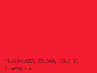 YUV 94.853,-23.099,129.048 Color is a normal red color and the nearest color is Red Pigment #ed1c24. Hex code #f21d30 and RGB value is rgb(242,29,48). In RGB color space, this color is composed of 95% red, 11% green, 19% blue, In CMYK color space, this color is composed of 0% cyan, 88% magenta, 80% yellow , 5% black , In HSL color space, this color has a hue angle of 355° , 89% saturation and 53% lightness.