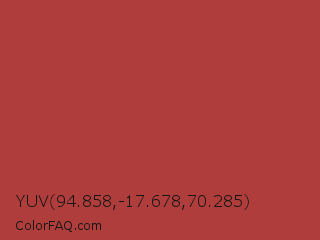 YUV 94.858,-17.678,70.285 Color is a normal red color and the nearest color is Medium Carmine #af4035. Hex code #af3d3b and RGB value is rgb(175,61,59). In RGB color space, this color is composed of 69% red, 24% green, 23% blue, In CMYK color space, this color is composed of 0% cyan, 65% magenta, 66% yellow , 31% black , In HSL color space, this color has a hue angle of 1° , 50% saturation and 46% lightness.
