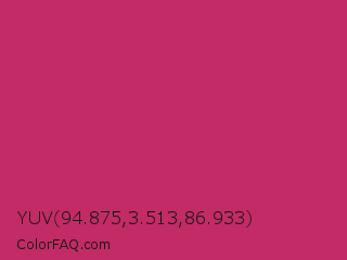 YUV 94.875,3.513,86.933 Color is a normal rose color and the nearest color is Hibiscus #b6316c. Hex code #c22b66 and RGB value is rgb(194,43,102). In RGB color space, this color is composed of 76% red, 17% green, 40% blue, In CMYK color space, this color is composed of 0% cyan, 78% magenta, 47% yellow , 24% black , In HSL color space, this color has a hue angle of 337° , 64% saturation and 46% lightness.