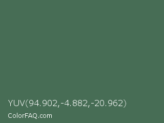 YUV 94.902,-4.882,-20.962 Color is a normal green color and the nearest color is Finlandia #556d56. Hex code #476d55 and RGB value is rgb(71,109,85). In RGB color space, this color is composed of 28% red, 43% green, 33% blue, In CMYK color space, this color is composed of 35% cyan, 0% magenta, 22% yellow , 57% black , In HSL color space, this color has a hue angle of 142° , 21% saturation and 35% lightness.