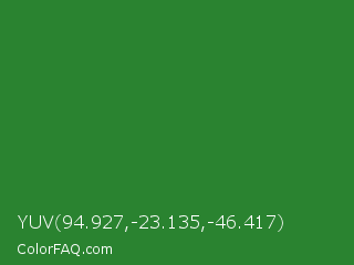 YUV 94.927,-23.135,-46.417 Color is a normal green color and the nearest color is Forest Green #228b22. Hex code #2a8330 and RGB value is rgb(42,131,48). In RGB color space, this color is composed of 16% red, 51% green, 19% blue, In CMYK color space, this color is composed of 68% cyan, 0% magenta, 63% yellow , 49% black , In HSL color space, this color has a hue angle of 124° , 51% saturation and 34% lightness.