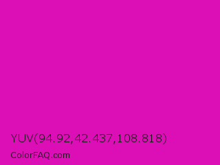 YUV 94.92,42.437,108.818 Color is a normal magenta color and the nearest color is Deep Magenta #cc00cc. Hex code #db0fb5 and RGB value is rgb(219,15,181). In RGB color space, this color is composed of 86% red, 6% green, 71% blue, In CMYK color space, this color is composed of 0% cyan, 93% magenta, 17% yellow , 14% black , In HSL color space, this color has a hue angle of 311° , 87% saturation and 46% lightness.
