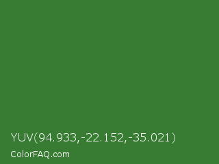 YUV 94.933,-22.152,-35.021 Color is a normal green color and the nearest color is Sap Green #507d2a. Hex code #377c32 and RGB value is rgb(55,124,50). In RGB color space, this color is composed of 22% red, 49% green, 20% blue, In CMYK color space, this color is composed of 56% cyan, 0% magenta, 60% yellow , 51% black , In HSL color space, this color has a hue angle of 116° , 43% saturation and 34% lightness.