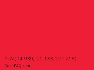 YUV 94.939,-20.183,127.218 Color is a normal red color and the nearest color is Imperial Red #ed2939. Hex code #f01d36 and RGB value is rgb(240,29,54). In RGB color space, this color is composed of 94% red, 11% green, 21% blue, In CMYK color space, this color is composed of 0% cyan, 88% magenta, 78% yellow , 6% black , In HSL color space, this color has a hue angle of 353° , 88% saturation and 53% lightness.