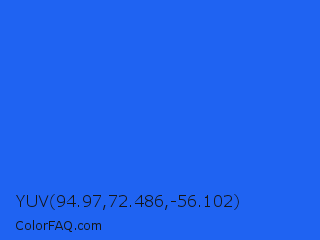 YUV 94.97,72.486,-56.102 Color is a normal blue color and the nearest color is Blue Crayola #1f75fe. Hex code #1f63f2 and RGB value is rgb(31,99,242). In RGB color space, this color is composed of 12% red, 39% green, 95% blue, In CMYK color space, this color is composed of 87% cyan, 59% magenta, 0% yellow , 5% black , In HSL color space, this color has a hue angle of 221° , 89% saturation and 54% lightness.