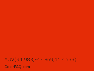 YUV 94.983,-43.869,117.533 Color is a normal red color and the nearest color is Ferrari Red #ff2800. Hex code #e52c06 and RGB value is rgb(229,44,6). In RGB color space, this color is composed of 90% red, 17% green, 2% blue, In CMYK color space, this color is composed of 0% cyan, 81% magenta, 97% yellow , 10% black , In HSL color space, this color has a hue angle of 10° , 95% saturation and 46% lightness.