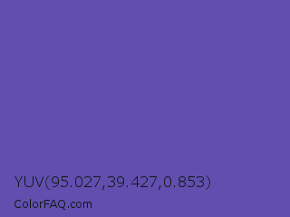 YUV 95.027,39.427,0.853 Color is a normal indigo color and the nearest color is Blue Violet #6456b7. Hex code #604faf and RGB value is rgb(96,79,175). In RGB color space, this color is composed of 38% red, 31% green, 69% blue, In CMYK color space, this color is composed of 45% cyan, 55% magenta, 0% yellow , 31% black , In HSL color space, this color has a hue angle of 251° , 38% saturation and 50% lightness.