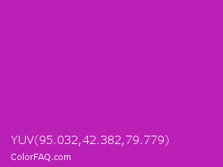 YUV 95.032,42.382,79.779 Color is a normal magenta color and the nearest color is Byzantine #bd33a4. Hex code #ba20b5 and RGB value is rgb(186,32,181). In RGB color space, this color is composed of 73% red, 13% green, 71% blue, In CMYK color space, this color is composed of 0% cyan, 83% magenta, 3% yellow , 27% black , In HSL color space, this color has a hue angle of 302° , 71% saturation and 43% lightness.