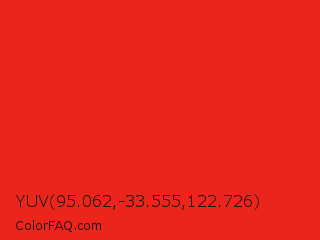 YUV 95.062,-33.555,122.726 Color is a normal red color and the nearest color is Lust #e62020. Hex code #eb251b and RGB value is rgb(235,37,27). In RGB color space, this color is composed of 92% red, 15% green, 11% blue, In CMYK color space, this color is composed of 0% cyan, 84% magenta, 89% yellow , 8% black , In HSL color space, this color has a hue angle of 3° , 84% saturation and 51% lightness.