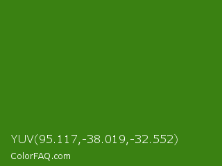 YUV 95.117,-38.019,-32.552 Color is a dark green color and the nearest color is La Palma #368716. Hex code #3a8112 and RGB value is rgb(58,129,18). In RGB color space, this color is composed of 23% red, 51% green, 7% blue, In CMYK color space, this color is composed of 55% cyan, 0% magenta, 86% yellow , 49% black , In HSL color space, this color has a hue angle of 98° , 76% saturation and 29% lightness.