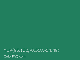 YUV 95.132,-0.558,-54.49 Color is a normal green color and the nearest color is Eucalyptus #278a5b. Hex code #217f5e and RGB value is rgb(33,127,94). In RGB color space, this color is composed of 13% red, 50% green, 37% blue, In CMYK color space, this color is composed of 74% cyan, 0% magenta, 26% yellow , 50% black , In HSL color space, this color has a hue angle of 159° , 59% saturation and 31% lightness.