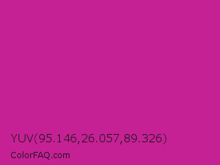 YUV 95.146,26.057,89.326 Color is a normal magenta color and the nearest color is Royal Fuchsia #ca2c92. Hex code #c52194 and RGB value is rgb(197,33,148). In RGB color space, this color is composed of 77% red, 13% green, 58% blue, In CMYK color space, this color is composed of 0% cyan, 83% magenta, 25% yellow , 23% black , In HSL color space, this color has a hue angle of 318° , 71% saturation and 45% lightness.