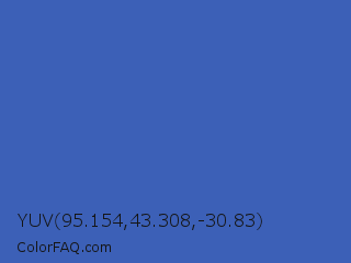 YUV 95.154,43.308,-30.83 Color is a normal blue color and the nearest color is San Marino #456cac. Hex code #3c60b7 and RGB value is rgb(60,96,183). In RGB color space, this color is composed of 24% red, 38% green, 72% blue, In CMYK color space, this color is composed of 67% cyan, 48% magenta, 0% yellow , 28% black , In HSL color space, this color has a hue angle of 222° , 51% saturation and 48% lightness.