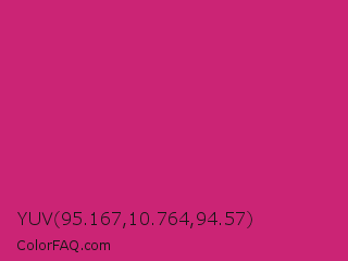 YUV 95.167,10.764,94.57 Color is a normal rose color and the nearest color is Magenta Dye #ca1f7b. Hex code #cb2475 and RGB value is rgb(203,36,117). In RGB color space, this color is composed of 80% red, 14% green, 46% blue, In CMYK color space, this color is composed of 0% cyan, 82% magenta, 42% yellow , 20% black , In HSL color space, this color has a hue angle of 331° , 70% saturation and 47% lightness.