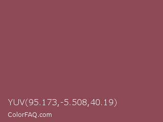 YUV 95.173,-5.508,40.19 Color is a normal red color and the nearest color is Copper Rust #944747. Hex code #8d4a54 and RGB value is rgb(141,74,84). In RGB color space, this color is composed of 55% red, 29% green, 33% blue, In CMYK color space, this color is composed of 0% cyan, 48% magenta, 40% yellow , 45% black , In HSL color space, this color has a hue angle of 351° , 31% saturation and 42% lightness.