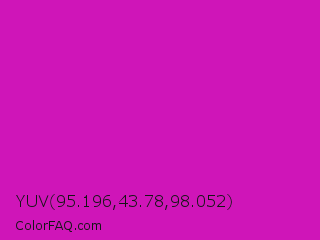 YUV 95.196,43.78,98.052 Color is a normal magenta color and the nearest color is Deep Magenta #cc00cc. Hex code #cf15b8 and RGB value is rgb(207,21,184). In RGB color space, this color is composed of 81% red, 8% green, 72% blue, In CMYK color space, this color is composed of 0% cyan, 90% magenta, 11% yellow , 19% black , In HSL color space, this color has a hue angle of 307° , 82% saturation and 45% lightness.