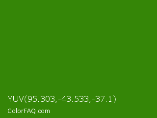 YUV 95.303,-43.533,-37.1 Color is a dark green color and the nearest color is Napier Green #2a8000. Hex code #358607 and RGB value is rgb(53,134,7). In RGB color space, this color is composed of 21% red, 53% green, 3% blue, In CMYK color space, this color is composed of 60% cyan, 0% magenta, 95% yellow , 47% black , In HSL color space, this color has a hue angle of 98° , 90% saturation and 28% lightness.