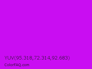 YUV 95.318,72.314,92.683 Color is a normal purple color and the nearest color is Vivid Orchid #cc00ff. Hex code #c90df2 and RGB value is rgb(201,13,242). In RGB color space, this color is composed of 79% red, 5% green, 95% blue, In CMYK color space, this color is composed of 17% cyan, 95% magenta, 0% yellow , 5% black , In HSL color space, this color has a hue angle of 289° , 90% saturation and 50% lightness.
