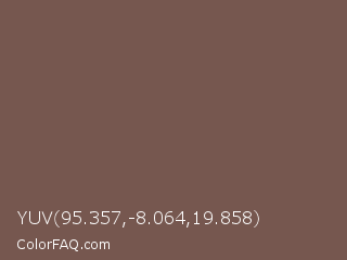 YUV 95.357,-8.064,19.858 Color is a normal red color and the nearest color is Roman Coffee #795d4c. Hex code #76574f and RGB value is rgb(118,87,79). In RGB color space, this color is composed of 46% red, 34% green, 31% blue, In CMYK color space, this color is composed of 0% cyan, 26% magenta, 33% yellow , 54% black , In HSL color space, this color has a hue angle of 12° , 20% saturation and 39% lightness.