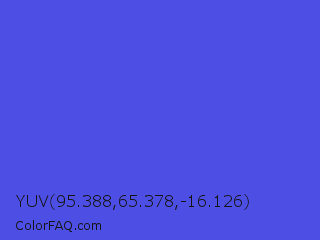YUV 95.388,65.378,-16.126 Color is a normal blue color and the nearest color is Majorelle Blue #6050dc. Hex code #4d4fe4 and RGB value is rgb(77,79,228). In RGB color space, this color is composed of 30% red, 31% green, 89% blue, In CMYK color space, this color is composed of 66% cyan, 65% magenta, 0% yellow , 11% black , In HSL color space, this color has a hue angle of 239° , 74% saturation and 60% lightness.