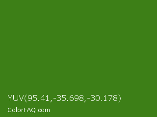 YUV 95.41,-35.698,-30.178 Color is a dark green color and the nearest color is La Palma #368716. Hex code #3d7f17 and RGB value is rgb(61,127,23). In RGB color space, this color is composed of 24% red, 50% green, 9% blue, In CMYK color space, this color is composed of 52% cyan, 0% magenta, 82% yellow , 50% black , In HSL color space, this color has a hue angle of 98° , 69% saturation and 29% lightness.