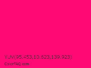 YUV 95.453,10.623,139.923 Color is a normal rose color and the nearest color is Winter Sky #ff007c. Hex code #ff0a75 and RGB value is rgb(255,10,117). In RGB color space, this color is composed of 100% red, 4% green, 46% blue, In CMYK color space, this color is composed of 0% cyan, 96% magenta, 54% yellow , 0% black , In HSL color space, this color has a hue angle of 334° , 100% saturation and 52% lightness.