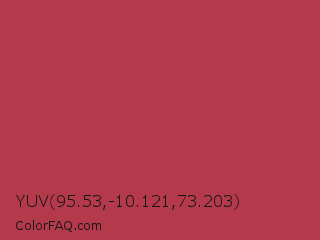 YUV 95.53,-10.121,73.203 Color is a normal red color and the nearest color is Night Shadz #aa375a. Hex code #b3394b and RGB value is rgb(179,57,75). In RGB color space, this color is composed of 70% red, 22% green, 29% blue, In CMYK color space, this color is composed of 0% cyan, 68% magenta, 58% yellow , 30% black , In HSL color space, this color has a hue angle of 351° , 52% saturation and 46% lightness.