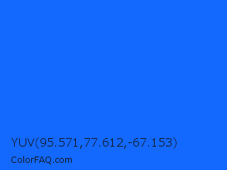 YUV 95.571,77.612,-67.153 Color is a normal blue color and the nearest color is Blue Crayola #1f75fe. Hex code #1368fd and RGB value is rgb(19,104,253). In RGB color space, this color is composed of 7% red, 41% green, 99% blue, In CMYK color space, this color is composed of 92% cyan, 59% magenta, 0% yellow , 1% black , In HSL color space, this color has a hue angle of 218° , 98% saturation and 53% lightness.
