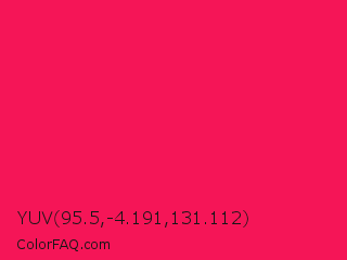 YUV 95.5,-4.191,131.112 Color is a normal rose color and the nearest color is Awesome #ff2052. Hex code #f51557 and RGB value is rgb(245,21,87). In RGB color space, this color is composed of 96% red, 8% green, 34% blue, In CMYK color space, this color is composed of 0% cyan, 91% magenta, 64% yellow , 4% black , In HSL color space, this color has a hue angle of 342° , 92% saturation and 52% lightness.
