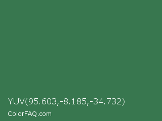 YUV 95.603,-8.185,-34.732 Color is a normal green color and the nearest color is Goblin #3d7d52. Hex code #38774f and RGB value is rgb(56,119,79). In RGB color space, this color is composed of 22% red, 47% green, 31% blue, In CMYK color space, this color is composed of 53% cyan, 0% magenta, 34% yellow , 53% black , In HSL color space, this color has a hue angle of 142° , 36% saturation and 34% lightness.