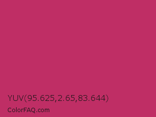 YUV 95.625,2.65,83.644 Color is a normal rose color and the nearest color is Hibiscus #b6316c. Hex code #bf2e65 and RGB value is rgb(191,46,101). In RGB color space, this color is composed of 75% red, 18% green, 40% blue, In CMYK color space, this color is composed of 0% cyan, 76% magenta, 47% yellow , 25% black , In HSL color space, this color has a hue angle of 337° , 61% saturation and 46% lightness.