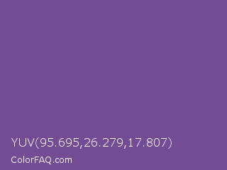 YUV 95.695,26.279,17.807 Color is a normal purple color and the nearest color is Dark Lavender #734f96. Hex code #744b95 and RGB value is rgb(116,75,149). In RGB color space, this color is composed of 45% red, 29% green, 58% blue, In CMYK color space, this color is composed of 22% cyan, 50% magenta, 0% yellow , 42% black , In HSL color space, this color has a hue angle of 273° , 33% saturation and 44% lightness.