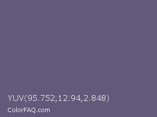 YUV 95.752,12.94,2.848 Color is a normal indigo color and the nearest color is Dolphin #646077. Hex code #63597a and RGB value is rgb(99,89,122). In RGB color space, this color is composed of 39% red, 35% green, 48% blue, In CMYK color space, this color is composed of 19% cyan, 27% magenta, 0% yellow , 52% black , In HSL color space, this color has a hue angle of 258° , 16% saturation and 41% lightness.