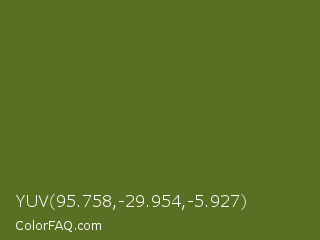 YUV 95.758,-29.954,-5.927 Color is a dark lime color and the nearest color is Fern Frond #657220. Hex code #596f23 and RGB value is rgb(89,111,35). In RGB color space, this color is composed of 35% red, 44% green, 14% blue, In CMYK color space, this color is composed of 20% cyan, 0% magenta, 68% yellow , 56% black , In HSL color space, this color has a hue angle of 77° , 52% saturation and 29% lightness.