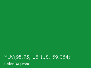 YUV 95.75,-18.118,-69.064 Color is a normal green color and the nearest color is North Texas Green #059033. Hex code #118f3b and RGB value is rgb(17,143,59). In RGB color space, this color is composed of 7% red, 56% green, 23% blue, In CMYK color space, this color is composed of 88% cyan, 0% magenta, 59% yellow , 44% black , In HSL color space, this color has a hue angle of 140° , 79% saturation and 31% lightness.