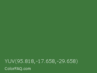 YUV 95.818,-17.658,-29.658 Color is a normal green color and the nearest color is Fern Green #4f7942. Hex code #3e783c and RGB value is rgb(62,120,60). In RGB color space, this color is composed of 24% red, 47% green, 24% blue, In CMYK color space, this color is composed of 48% cyan, 0% magenta, 50% yellow , 53% black , In HSL color space, this color has a hue angle of 118° , 33% saturation and 35% lightness.
