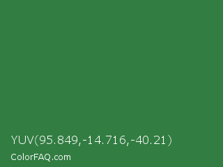 YUV 95.849,-14.716,-40.21 Color is a normal green color and the nearest color is Goblin #3d7d52. Hex code #327d42 and RGB value is rgb(50,125,66). In RGB color space, this color is composed of 20% red, 49% green, 26% blue, In CMYK color space, this color is composed of 60% cyan, 0% magenta, 47% yellow , 51% black , In HSL color space, this color has a hue angle of 133° , 43% saturation and 34% lightness.