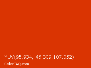 YUV 95.934,-46.309,107.052 Color is a normal red color and the nearest color is Grenadier #d54600. Hex code #da3402 and RGB value is rgb(218,52,2). In RGB color space, this color is composed of 85% red, 20% green, 1% blue, In CMYK color space, this color is composed of 0% cyan, 76% magenta, 99% yellow , 15% black , In HSL color space, this color has a hue angle of 14° , 98% saturation and 43% lightness.