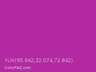 YUV 95.942,32.074,72.842 Color is a normal magenta color and the nearest color is Byzantine #bd33a4. Hex code #b329a1 and RGB value is rgb(179,41,161). In RGB color space, this color is composed of 70% red, 16% green, 63% blue, In CMYK color space, this color is composed of 0% cyan, 77% magenta, 10% yellow , 30% black , In HSL color space, this color has a hue angle of 308° , 63% saturation and 43% lightness.