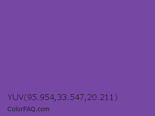 YUV 95.954,33.547,20.211 Color is a normal purple color and the nearest color is Royal Purple #7851a9. Hex code #7747a4 and RGB value is rgb(119,71,164). In RGB color space, this color is composed of 47% red, 28% green, 64% blue, In CMYK color space, this color is composed of 27% cyan, 57% magenta, 0% yellow , 36% black , In HSL color space, this color has a hue angle of 271° , 40% saturation and 46% lightness.