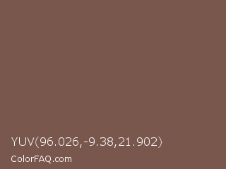 YUV 96.026,-9.38,21.902 Color is a normal red color and the nearest color is Roman Coffee #795d4c. Hex code #79574d and RGB value is rgb(121,87,77). In RGB color space, this color is composed of 47% red, 34% green, 30% blue, In CMYK color space, this color is composed of 0% cyan, 28% magenta, 36% yellow , 53% black , In HSL color space, this color has a hue angle of 14° , 22% saturation and 39% lightness.