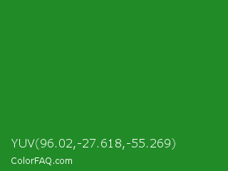 YUV 96.02,-27.618,-55.269 Color is a normal green color and the nearest color is Forest Green #228b22. Hex code #218b28 and RGB value is rgb(33,139,40). In RGB color space, this color is composed of 13% red, 55% green, 16% blue, In CMYK color space, this color is composed of 76% cyan, 0% magenta, 71% yellow , 45% black , In HSL color space, this color has a hue angle of 124° , 62% saturation and 34% lightness.