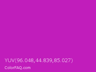 YUV 96.048,44.839,85.027 Color is a normal magenta color and the nearest color is Steel Pink #cc33cc. Hex code #c11dbb and RGB value is rgb(193,29,187). In RGB color space, this color is composed of 76% red, 11% green, 73% blue, In CMYK color space, this color is composed of 0% cyan, 85% magenta, 3% yellow , 24% black , In HSL color space, this color has a hue angle of 302° , 74% saturation and 44% lightness.