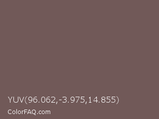 YUV 96.062,-3.975,14.855 Color is a normal red color and the nearest color is Russett #755a57. Hex code #715958 and RGB value is rgb(113,89,88). In RGB color space, this color is composed of 44% red, 35% green, 35% blue, In CMYK color space, this color is composed of 0% cyan, 21% magenta, 22% yellow , 56% black , In HSL color space, this color has a hue angle of 2° , 12% saturation and 39% lightness.