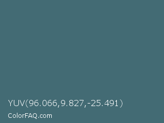 YUV 96.066,9.827,-25.491 Color is a normal cyan color and the nearest color is Blue Bayoux #496679. Hex code #436b74 and RGB value is rgb(67,107,116). In RGB color space, this color is composed of 26% red, 42% green, 45% blue, In CMYK color space, this color is composed of 42% cyan, 8% magenta, 0% yellow , 55% black , In HSL color space, this color has a hue angle of 191° , 27% saturation and 36% lightness.