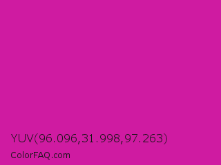 YUV 96.096,31.998,97.263 Color is a normal magenta color and the nearest color is Royal Fuchsia #ca2c92. Hex code #cf1ba1 and RGB value is rgb(207,27,161). In RGB color space, this color is composed of 81% red, 11% green, 63% blue, In CMYK color space, this color is composed of 0% cyan, 87% magenta, 22% yellow , 19% black , In HSL color space, this color has a hue angle of 315° , 77% saturation and 46% lightness.