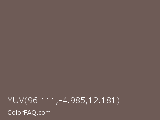 YUV 96.111,-4.985,12.181 Color is a normal red color and the nearest color is Pine Cone #6d5e54. Hex code #6e5b56 and RGB value is rgb(110,91,86). In RGB color space, this color is composed of 43% red, 36% green, 34% blue, In CMYK color space, this color is composed of 0% cyan, 17% magenta, 22% yellow , 57% black , In HSL color space, this color has a hue angle of 13° , 12% saturation and 38% lightness.